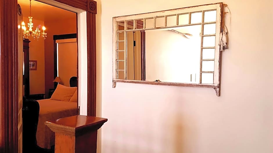This first-floor guestroom has a queen bed decorated with a brass bed frame, surrounded by a large Queen Anne cottage-style window, vaulted ceilings, and an original-style brick fireplace. Decorated with Scottish oak antiques, restored old-growth redwood trim, and a crystal chandelier. It is located just next to our living room in our historic Pacific Coast Steamship Company building for easy access. Guests have a garden view with Fremont’s Peak in the distance. This room is wheelchair accessible and compliant with the Americans with Disability Act (ADA). It has a private bath with a stall shower.